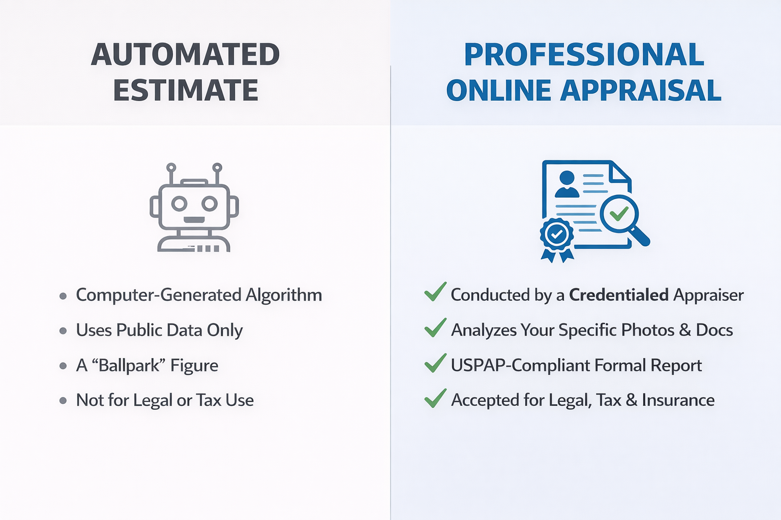 Professional online appraisals are conducted by licensed, credentialed appraisers, include personal review of your specific property or item, analyze photos, documentation, and market research, result in formal USPAP-compliant reports, and are accepted for legal purposes, insurance claims, tax matters, and more.