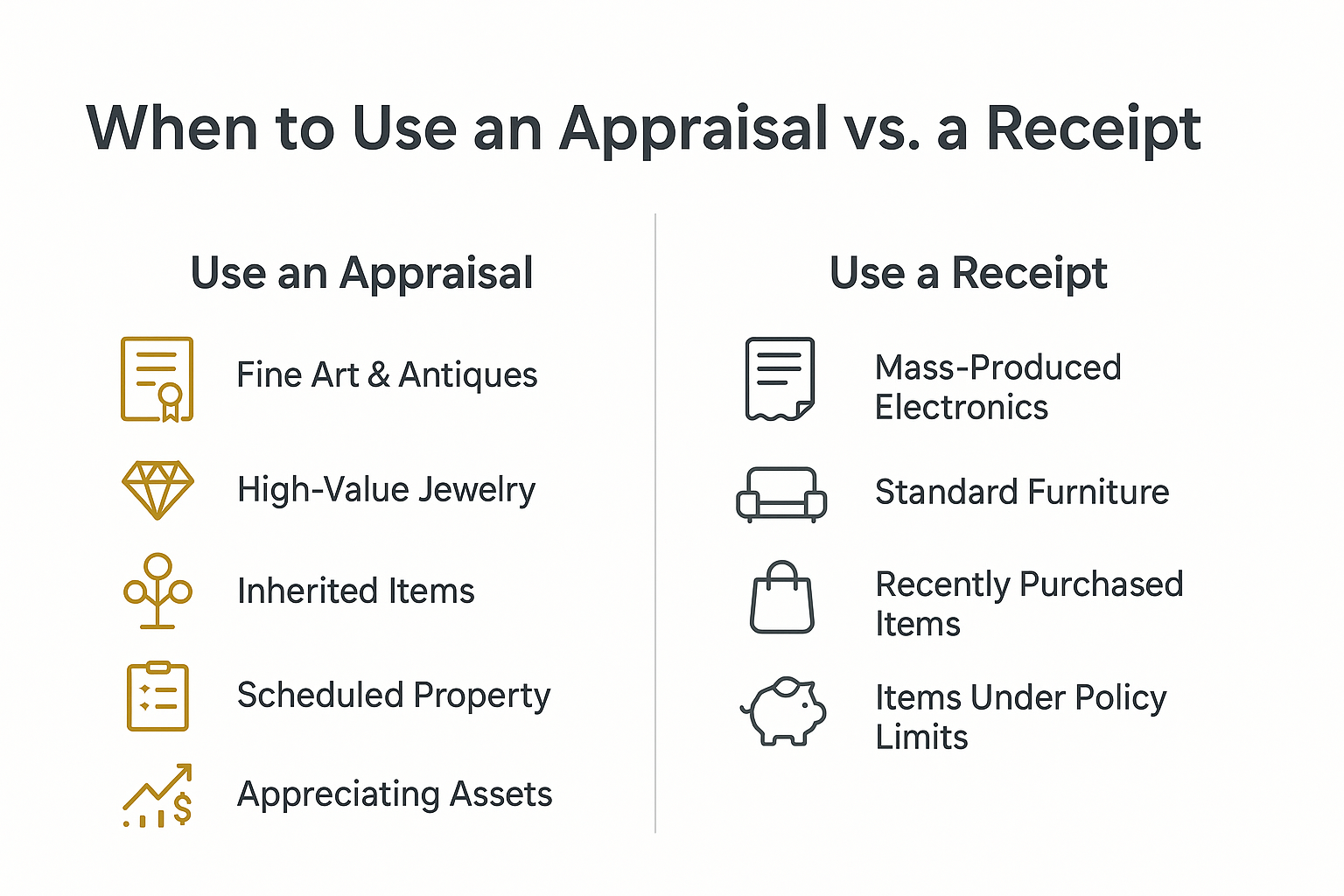 When you file an insurance claim for a lost, stolen, or damaged valuable, your provider will ask for one thing above all else: proof of value. The two most common forms of documentation are a purchase receipt and a professional appraisal, but they are not interchangeable.