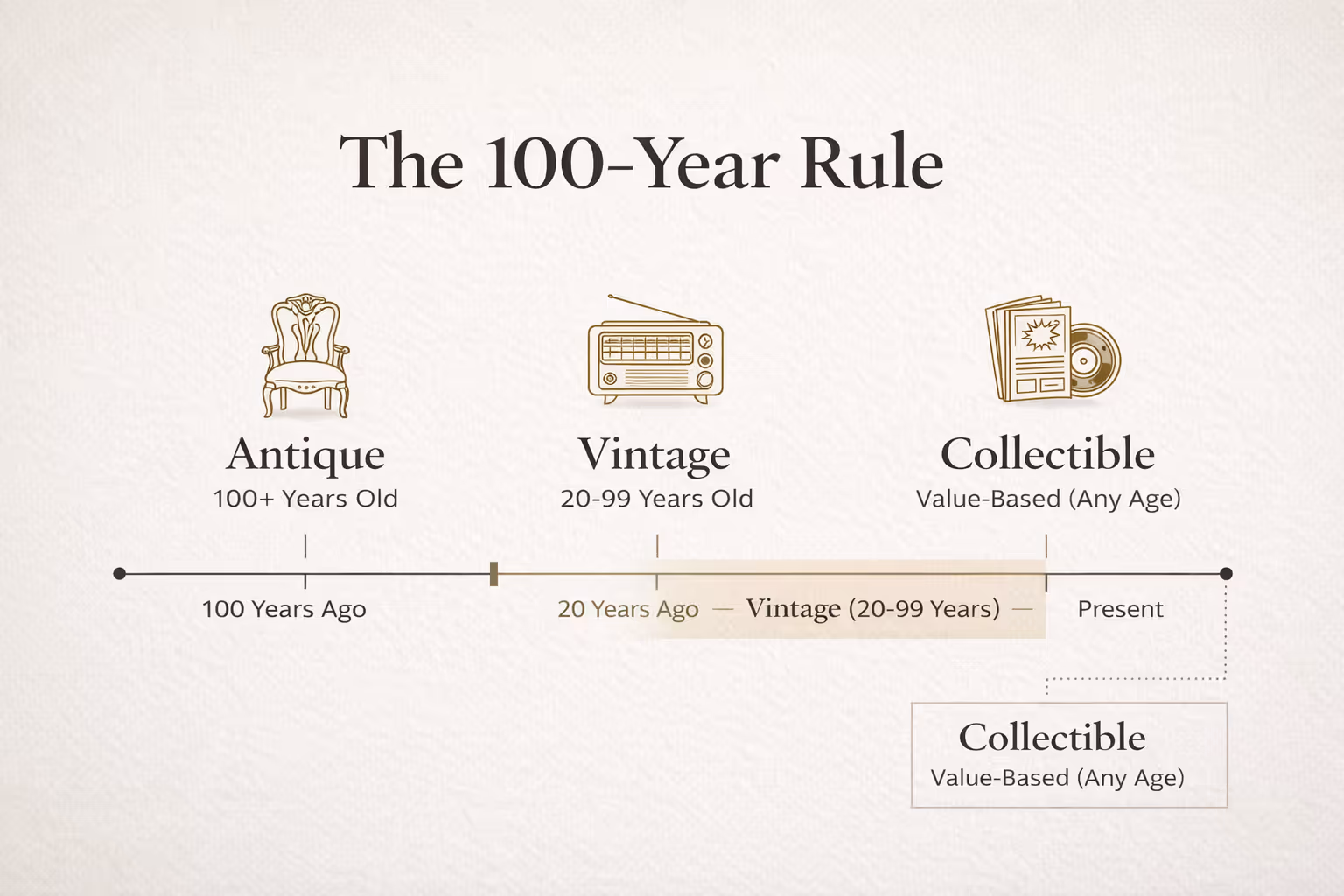 The “100-year rule” is your first line of defense, as forgers often try to pass off newer vintage items as genuine antiques.