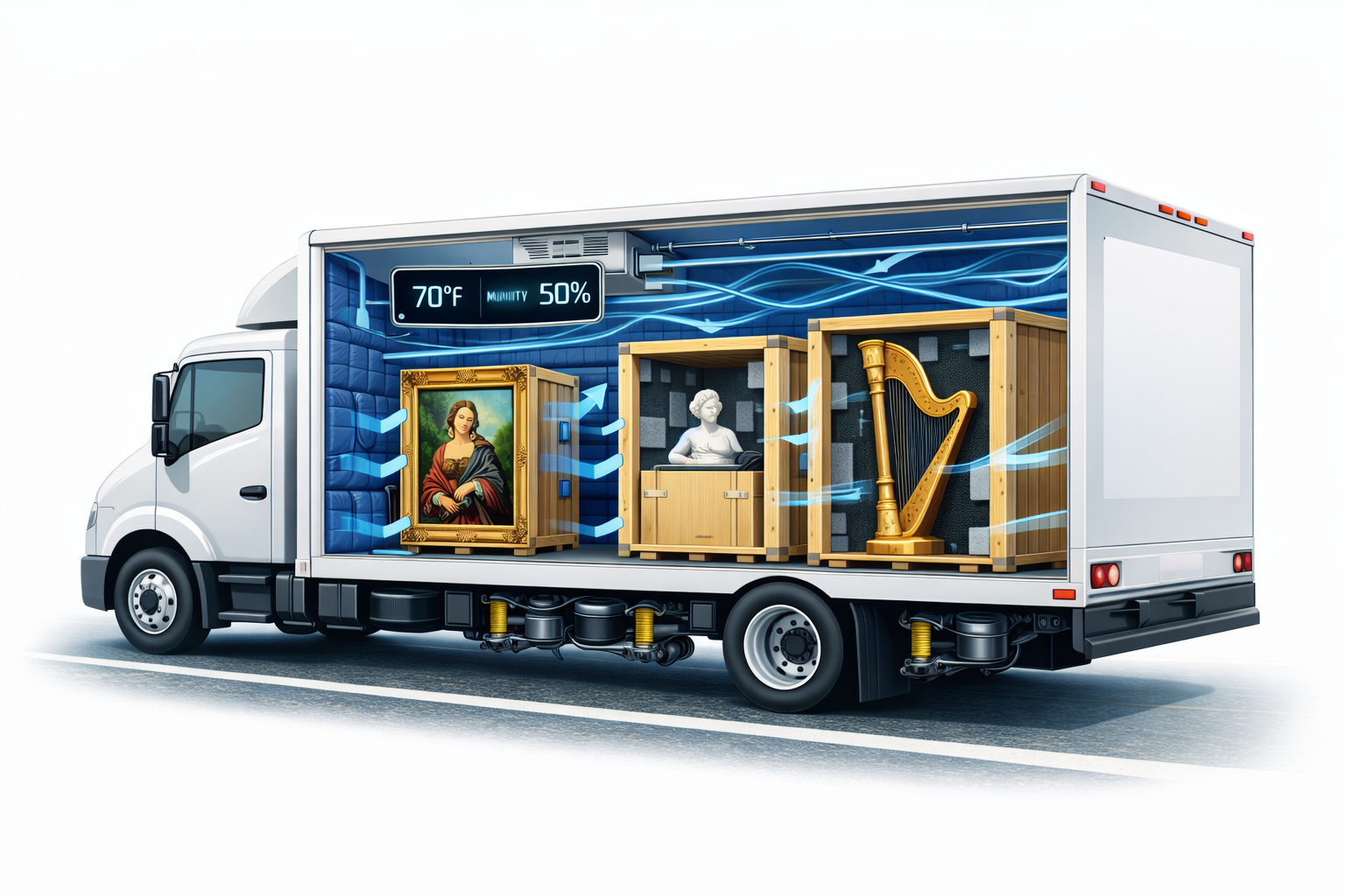 Temperature and humidity fluctuations pose the greatest danger. Standard moving trucks experience temperature swings between -21°F and 135°F, with humidity ranging from 40% to 90%. Extreme conditions can crack oil paintings, warp wooden antiques, and cause metal corrosion within hours. Vibration damage from road shock, loading impacts, and engine vibration also cause cumulative damage that professional handlers report can be amplified in standard foam-cushioned crates.