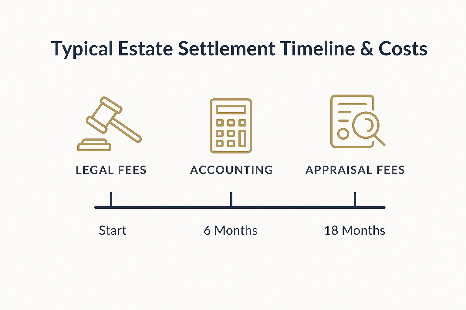A typical estate settlement takes 6 to 18 months and can cost 5-10% of the estate’s total value. While you should budget for legal and accounting services, professional appraisals are one of the best investments you can make. When you consider that IRS penalties for incorrect valuations can be as high as 40% of the tax owed, the cost of a defensible appraisal—with transparent pricing—is minimal in comparison.
