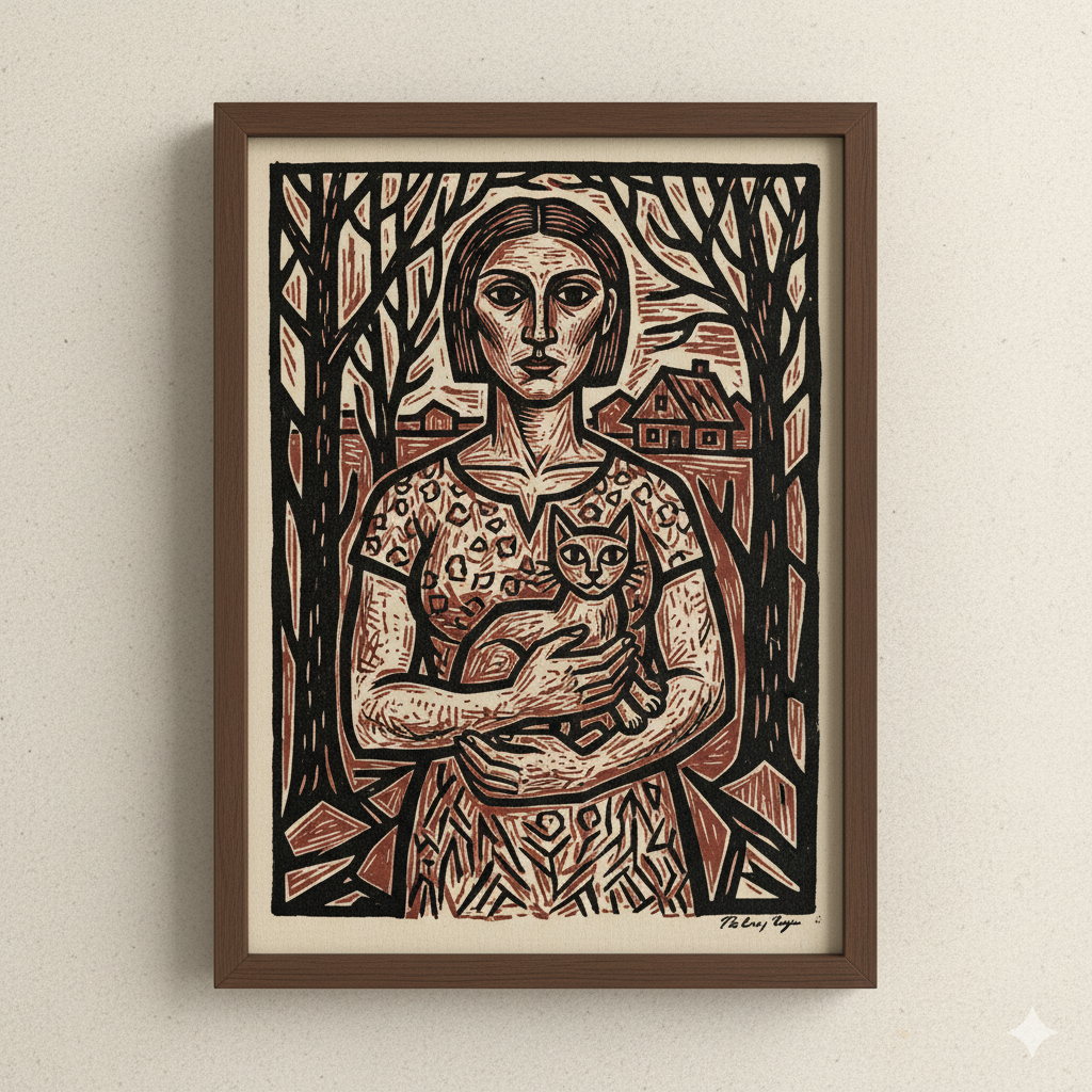 Image: Google Gemini created this woodblock print in the style of German Expressionist artist Karl Schmidt-Rottluff. Editioned prints allow for close comparables.